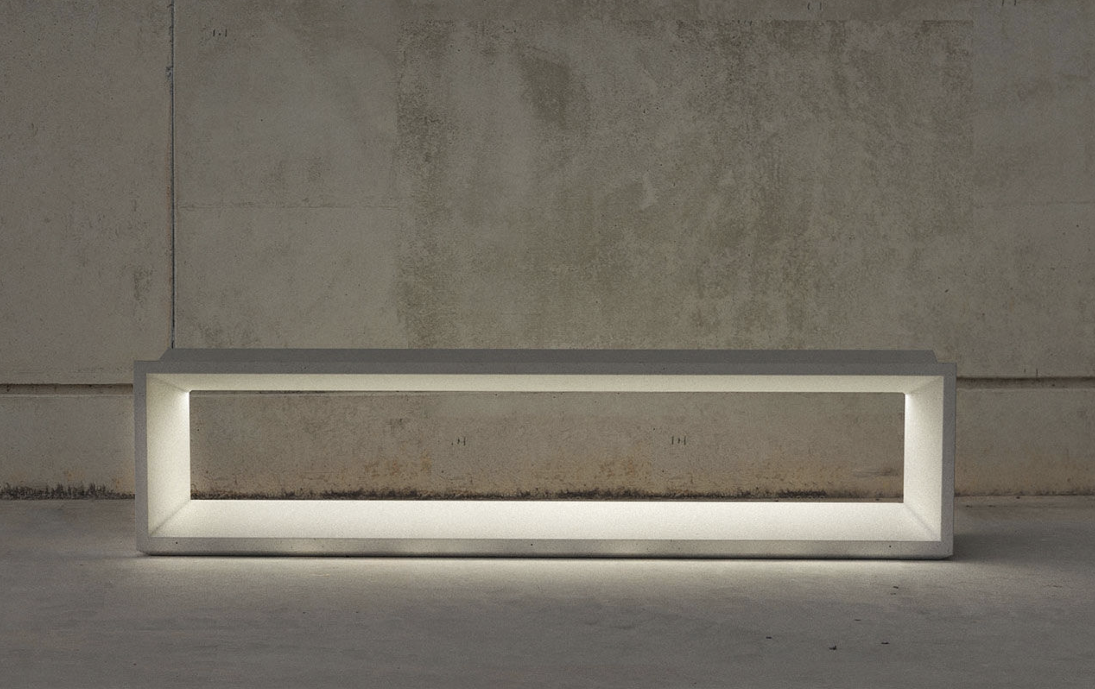 Collection consisting of bench and bollard or individual bench with lighting in solid concrete. The design of the elements aims to use straight lines, on the inside to create surfaces to project light and on the outside as a way to prevent the accumulation of water.